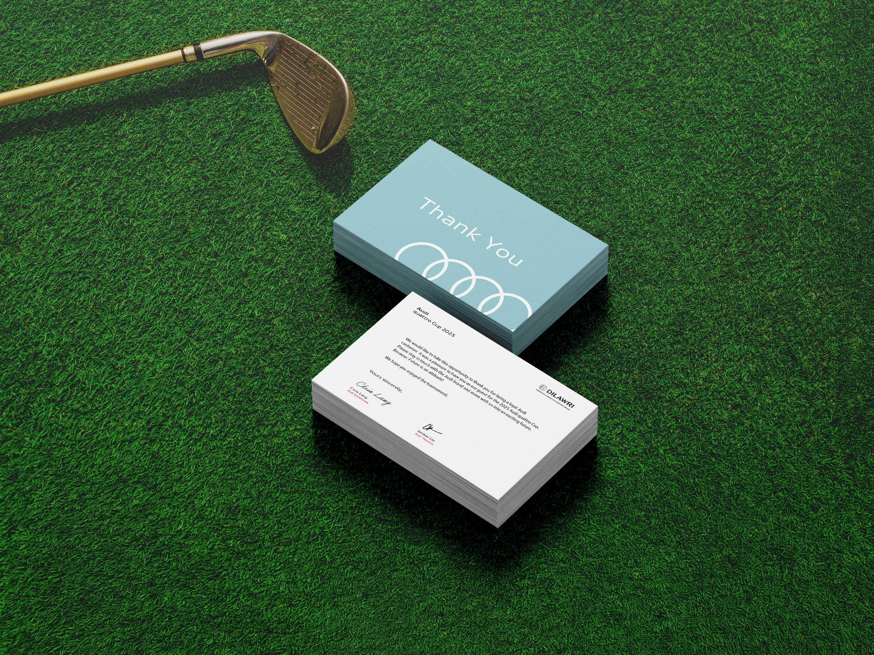 The Audi Quattro Cup was not just a golf tournament, but an experience designed to strengthen relationships with existing and potential clients of the brand. The challenge was to bring the Audi universe into a sporting and social event, carefully curating every detail so that participants could feel the quality, precision, and sophistication that define the brand. From flags, hole signage, and thematic scorecards to personalized menus and thank-you cards, every POP piece was created as part of an immersive journey. Even the scorecards were customized, reinforcing the connection between the competitive spirit of golf and the excellence of Audi.