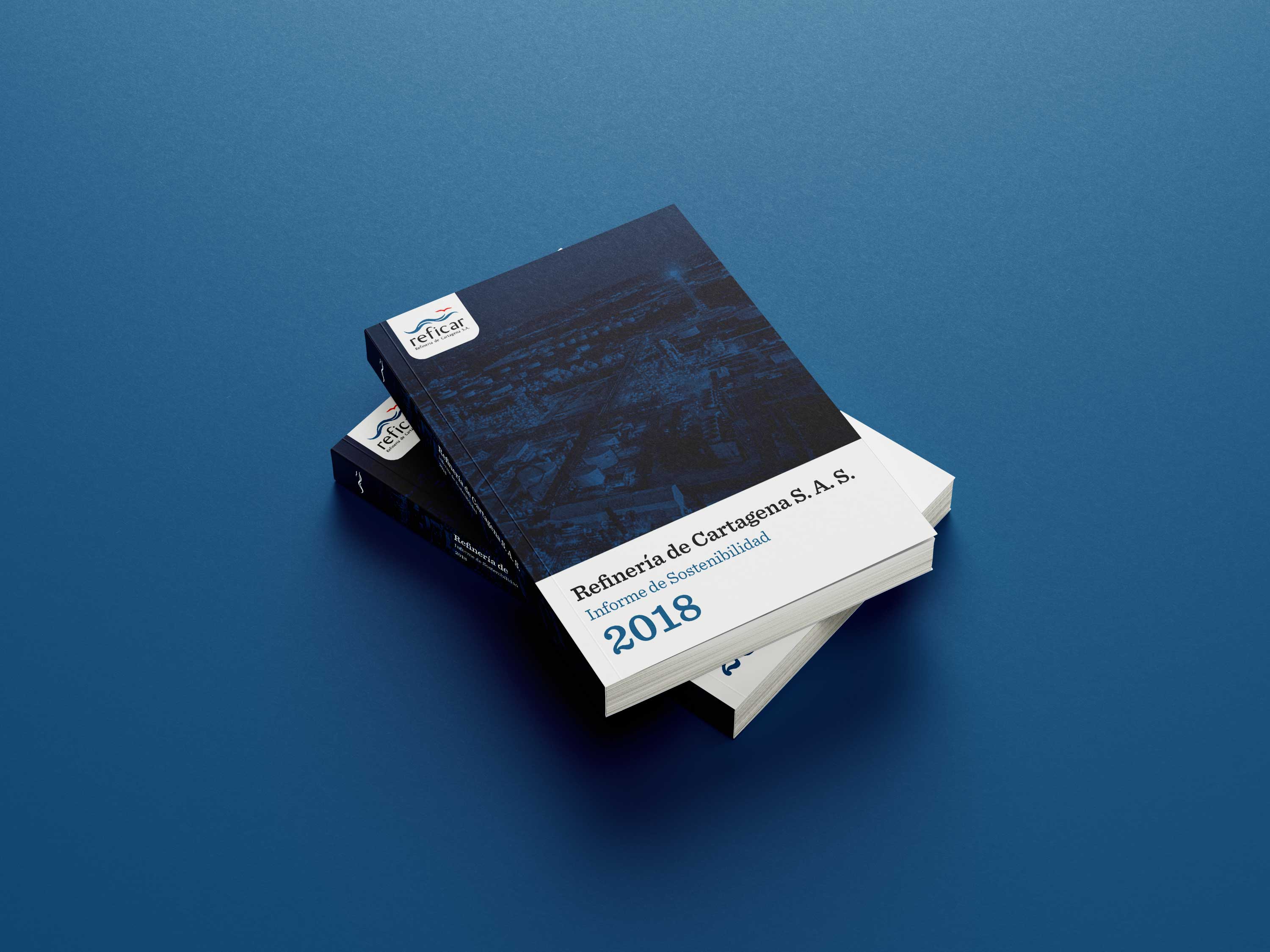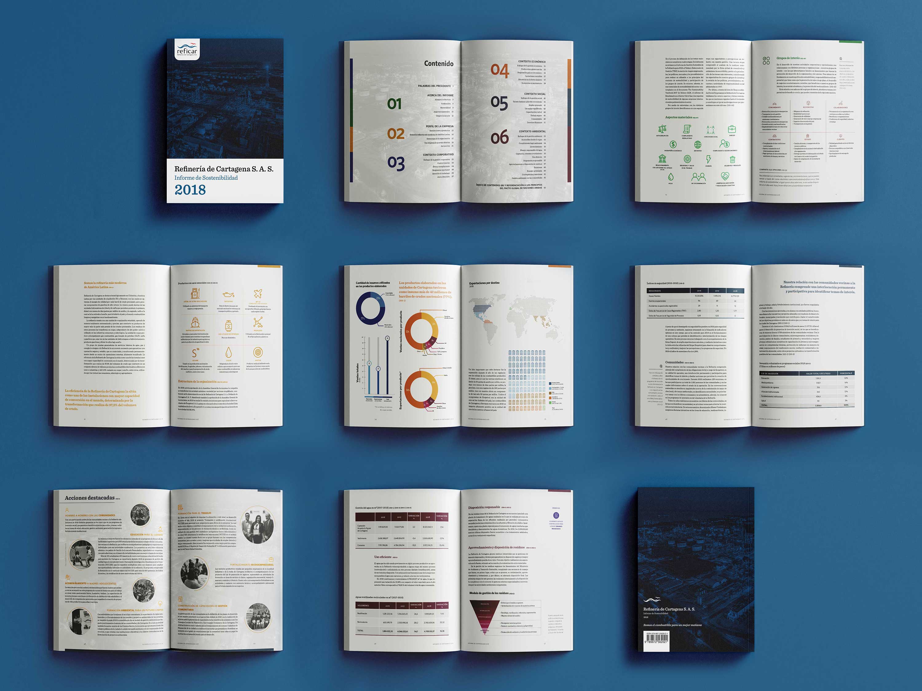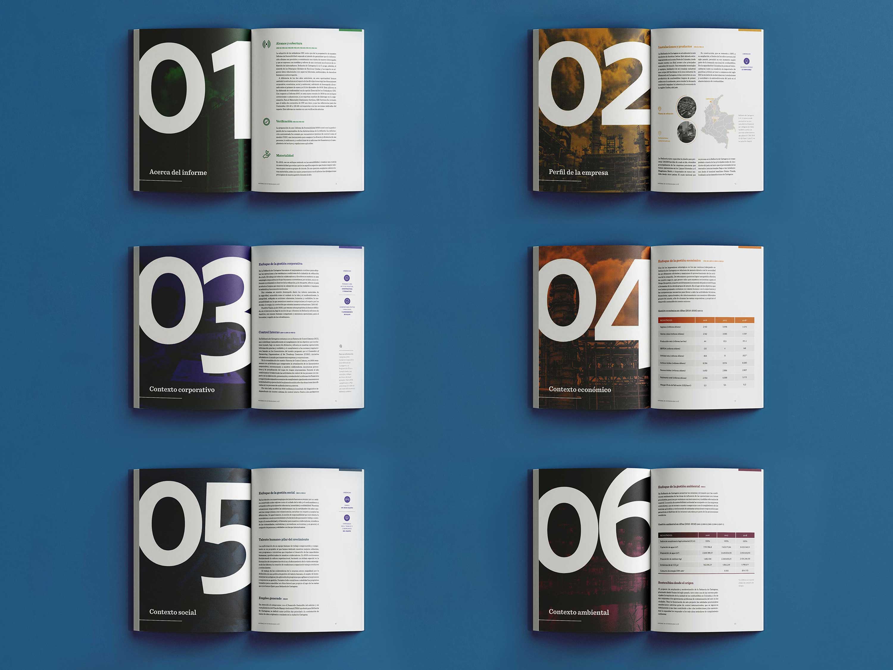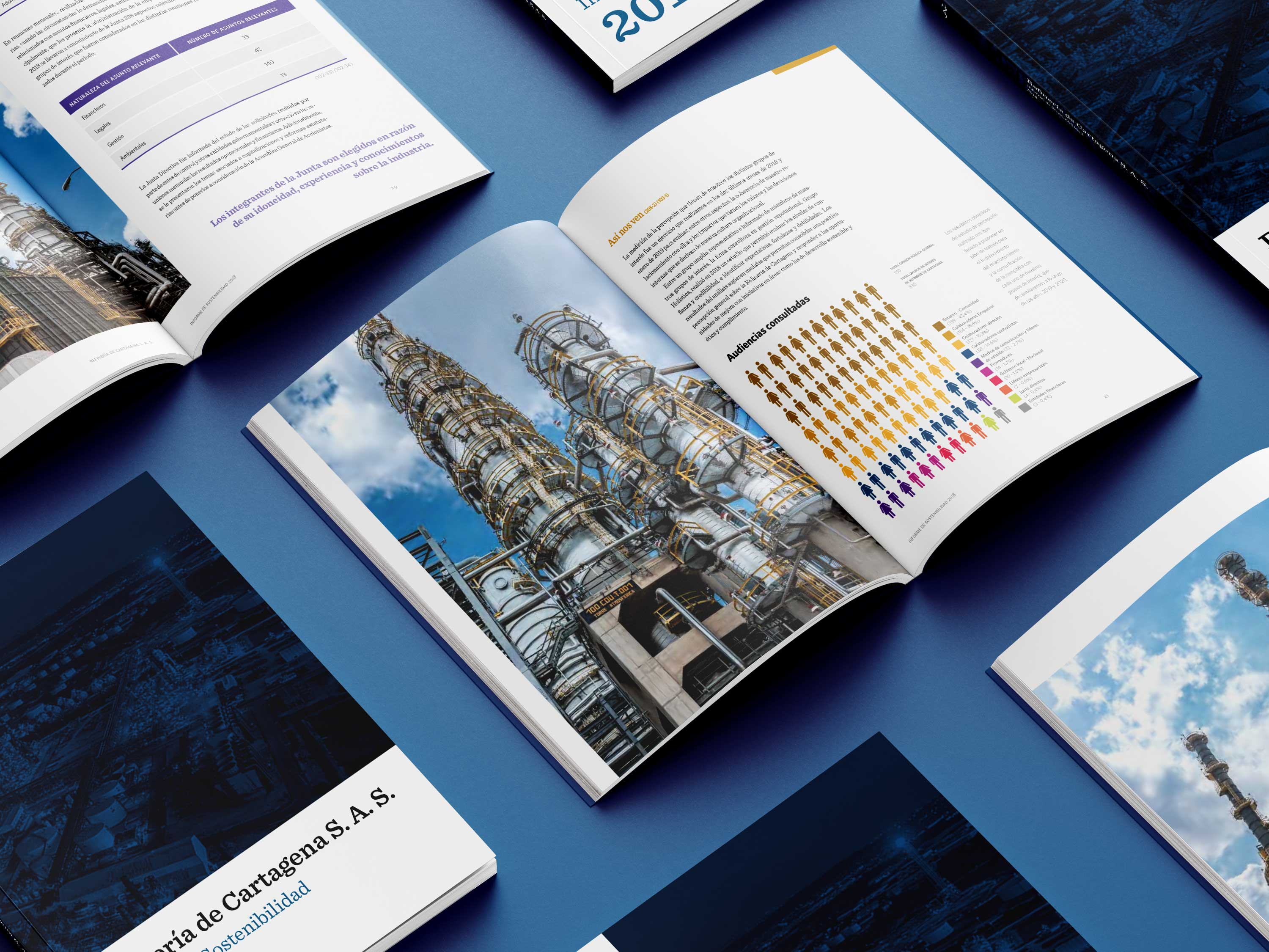 The editorial project for Reficar (Cartagena Refinery) aimed to transform a dense management report filled with technical data, numbers, and charts into an engaging, visually compelling publication. The challenge was to make the information accessible to diverse audiences, from executives to employees and external stakeholders. The design solution relied on strategic use of color conventions to separate chapters and create a visual rhythm that guided readers effortlessly through the content.