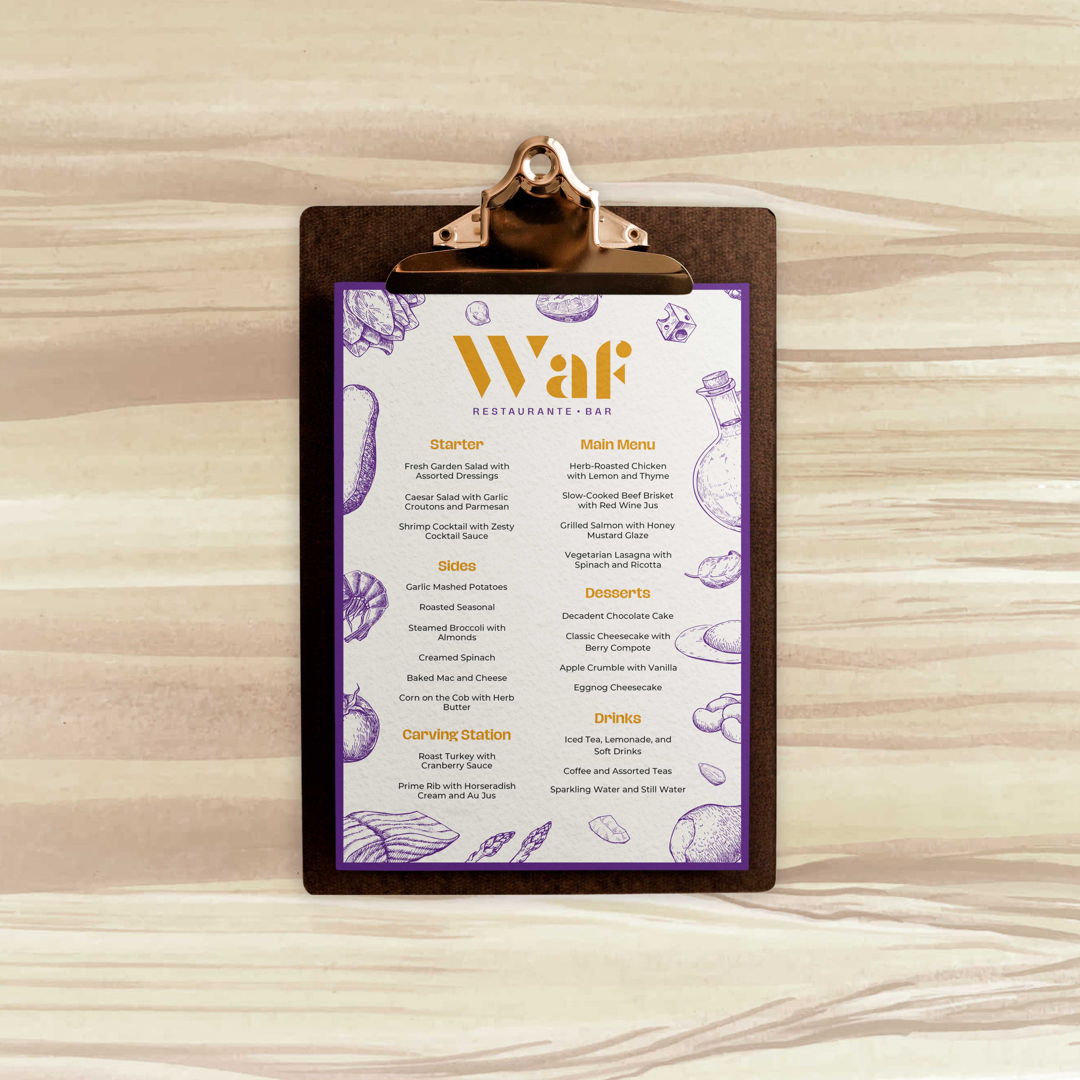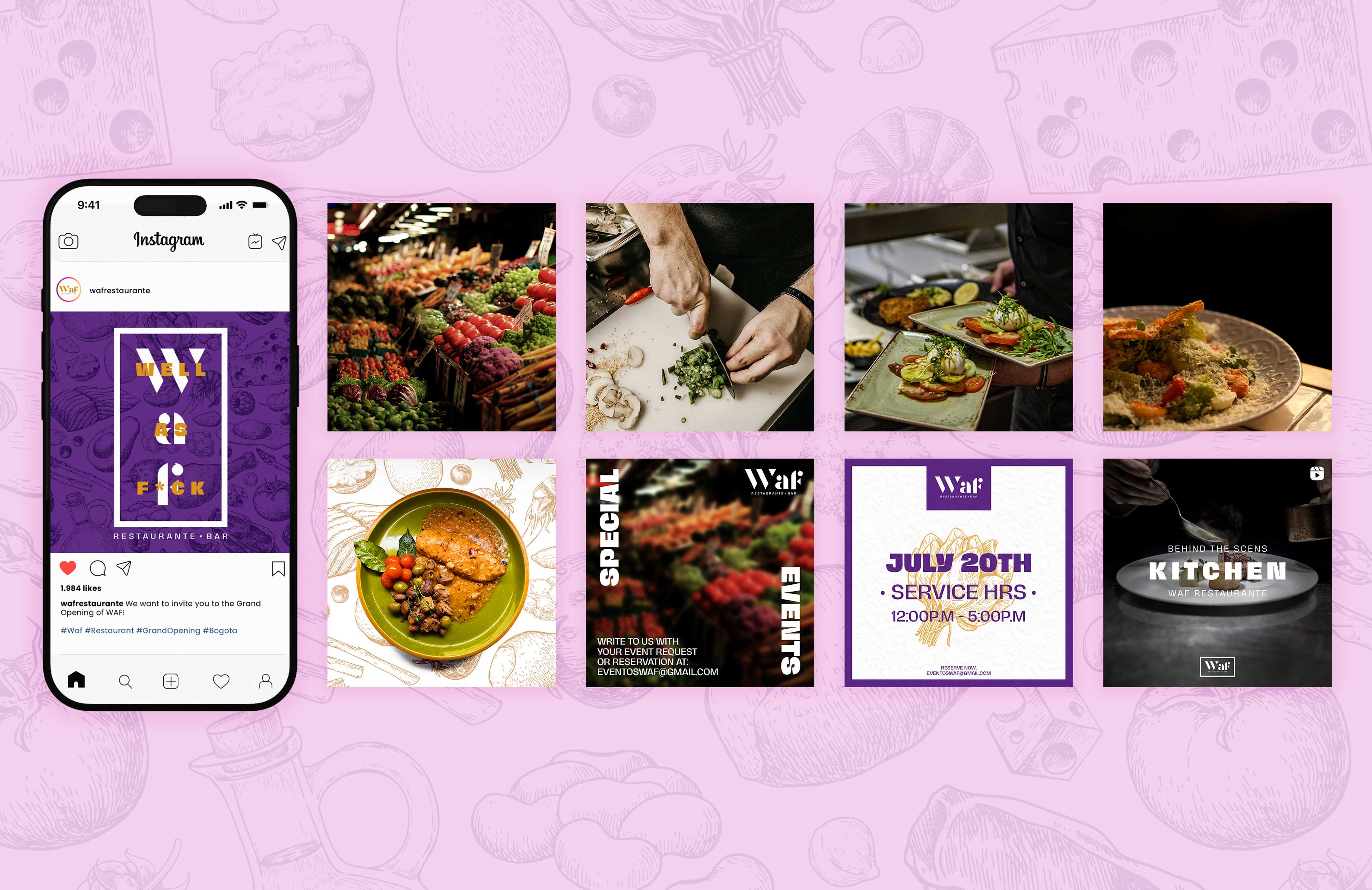 To preserve brand continuity, the original yellow and purple palette was retained but refined into a more balanced and contemporary combination. A custom lettering-based logo gave the restaurant a modern, minimalist look, ensuring clarity and flexibility across platforms. The new identity extended into menus, branded delivery bags, aprons, coasters, the website, and in-store decorative pieces. On social media, the concept was reinforced through minimalist food photography and images of fresh market produce. The rebranding elevated WAF’s positioning, making its visual presence as memorable and authentic as its culinary experience.