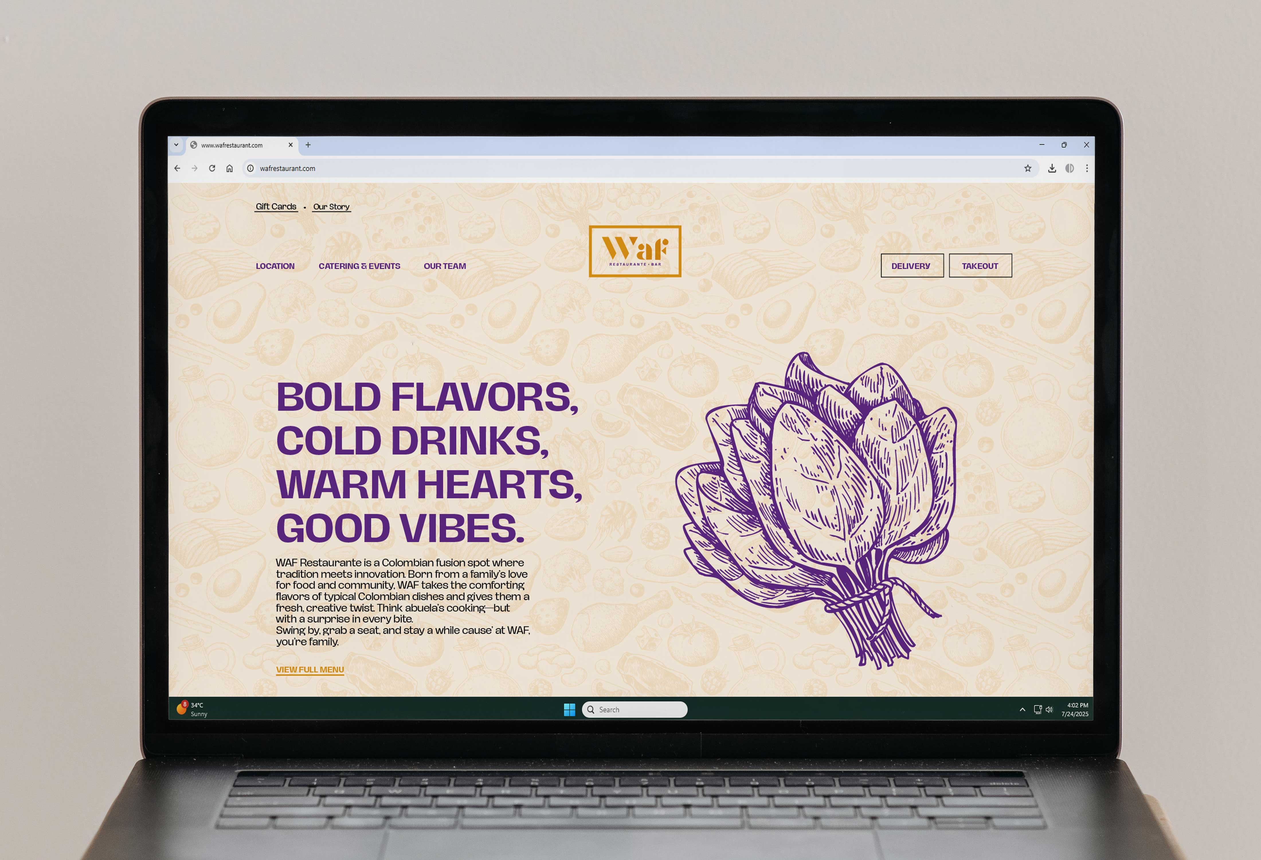 Located in Bogotá’s growing culinary district, WAF Restaurante needed a stronger identity to reflect its unique offering: Colombian cuisine infused with fusion flavors, centered on fresh ingredients and the chef’s creativity. The previous brand lacked presence in a competitive landscape, making rebranding essential to highlight WAF’s vision. The new design drew inspiration from the love of ingredients and the richness of Colombian food culture, featuring graphic elements full of illustrated produce reminiscent of a lively market scene.