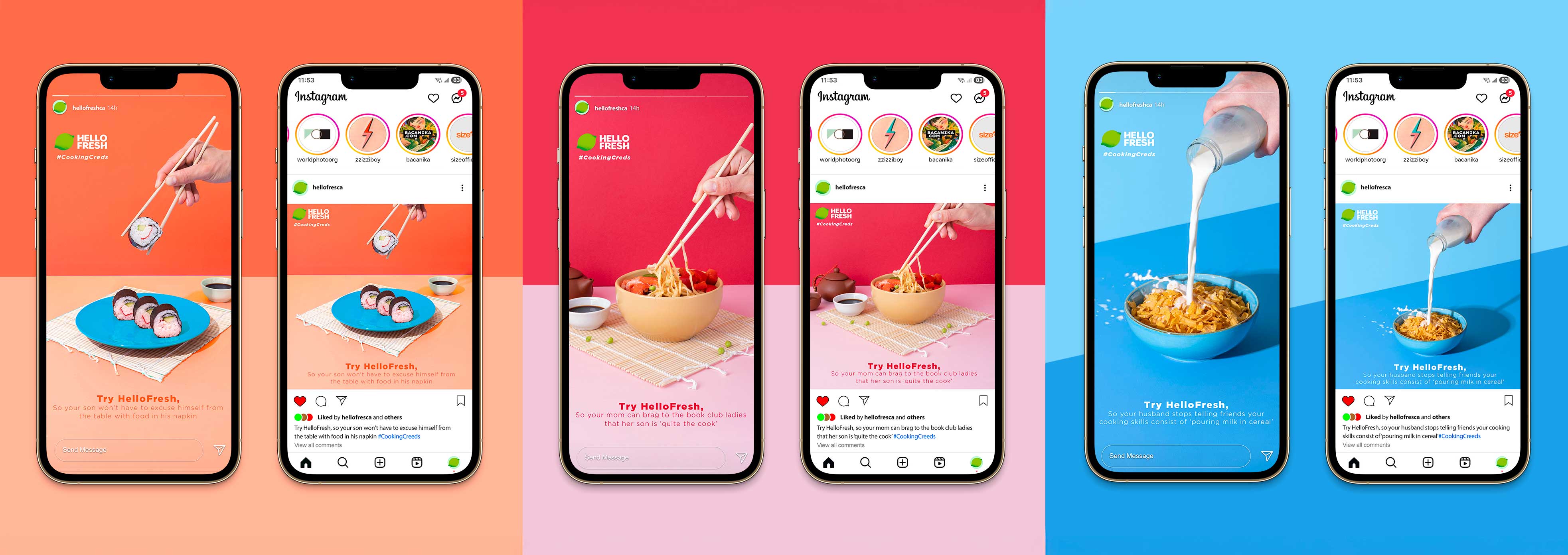 The CookingCreds campaign was created to show that cooking with HelloFresh doesn’t require culinary expertise — anyone can prepare delicious, easy, and impressive meals. The challenge was to communicate this accessibility in a playful, lighthearted way that aligned with the brand’s fresh identity. The creative direction leaned on minimalist food photography set against bold, colorful backgrounds that spotlighted the dishes. Copywriting completed the concept with witty and humorous lines such as “Try HelloFresh, so your mom can brag you’re quite the cook” or “Try HelloFresh, so your husband stops saying your specialty is pouring milk on cereal.” Each variation was tailored to the medium to maximize impact and relatability.